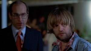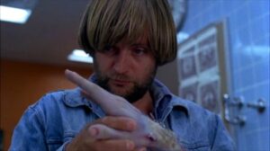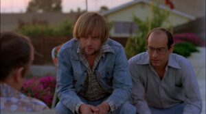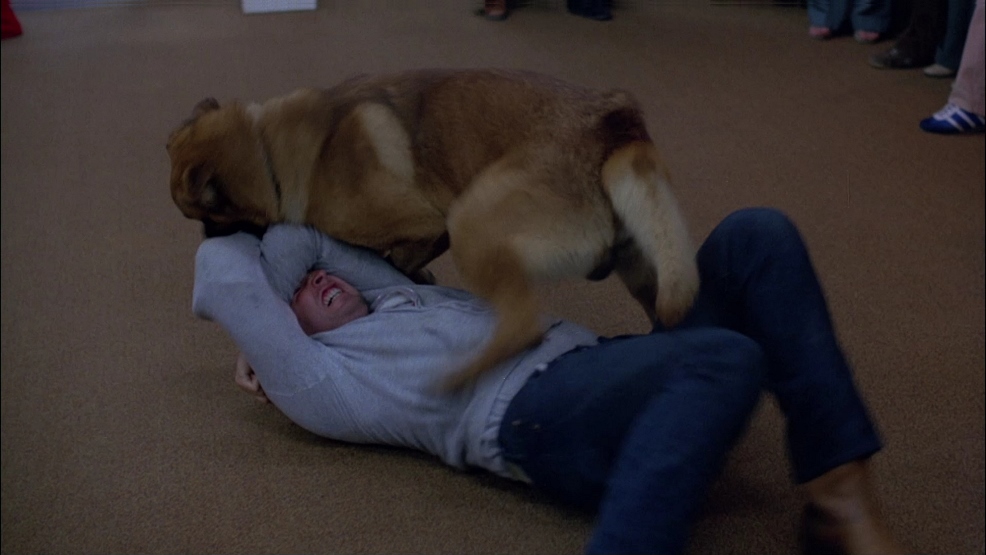 La fiesta prosigue y así conocemos al protagonista, el profesor de biología Harlan Thompson, interpretado por David McCallum, quien luce un aspecto muy jipi, con melenita media y barba. Trabaja desde hace poco en la universidad de la localidad, y aún no se ha adaptado, acaso por su aire prepotente y engreído, donde se siente superior a todos los demás. En los terrenos del pueblo se ha puesto en marcha un colisionador de partículas, y durante gran parte de la película se insistirá machaconamente sobre él, acaso para sugerirnos que el comportamiento de los perros está causado por el aparato. También una posterior charla de otro profesor, Michael Fitzgerald (George Wyner) sobre feromonas da alguna otra pista al respecto.