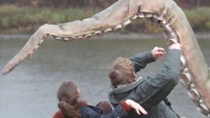 No queda muy claro el origen del monstruo. El científico menciona que en ocasiones se han descubierto cefalópodos en agua dulce, pero acerca de su desmesurado tamaño nada se menciona. Se trata de un calamar gigante (o Architeuthis dux), criatura que puede alcanzar hasta los cinco metros, pero aquí queda obvio que es mucho más grande aún, con un grosor de tentáculo de unos treinta centímetros o más.