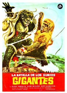 Estrenado en España con muchísimo retraso, como era habitual en el caos de exhibición del cine fantástico japonés, y con un título de lo más ridículo pero que ha devenido mítico[3], La batalla de los simios gigantes es un delicioso kaiju eiga con todos los defectos y virtudes inherentes en este tipo de cine. Entre las lacras cabe destacar un guion ingenuo y sencillo, donde resaltan particularmente unas decisiones, impulsos, comentarios y acciones de los personajes ―aun cuando sean científicos, militares o primeros ministros― de una candidez propia de un niño de doce años, o los consabidos efectos especiales de personas embutidas en cachazudos trajes destrozando maquetas. En el lado positivo cabe apuntar una puesta en escena elegante, poética, que aúna lo kitsch con lo naïf, un tratamiento del color de gran atractivo, y una capacidad extraordinaria para dar paso con una sencillez inaudita de los momentos graves y solemnes a los dinámicos y distendidos. Añadamos, por lo demás, el interesante comentario de Carlos y Daniel Aguilar[4], quienes ven que el film “acaso desorbitando, puede leerse como una paráfrasis de la leyenda sintoísta sobre la rivalidad entre los hermanos divinos Yamahiko (de la montaña) y Umihiko (del mar)”.