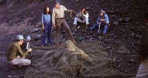 Véase el momento, por ejemplo, donde uno de los miembros de la expedición está vigilando al monstruo, sedado y retenido en una red. El individuo se queda dormido y es despertado por la chica, con la cual se pone a hablar, literalmente, sobre la inmensidad del universo. Y la criatura aprovecha para escapar y atacarles. El guion, ciertamente, parece un tanto improvisado sobre la marcha. La propia captura de la criatura se basa en argumentos absurdos: rodean al bicho con gasolina y la encienden, creando un círculo de fuego donde la tienen retenida. Luego, uno de los personajes refiere que “el fuego consumirá el oxígeno que tiene alrededor”. Eso, en medio del campo. Pero el caso es que la bestia se desmaya. En otro momento, cuando es de noche, los hombres repelen a la bestia enfocándoles las linternas en los ojos, pues parece que la luz le molesta, cuando con anterioridad ha vagado en pleno día sin el menor problema.