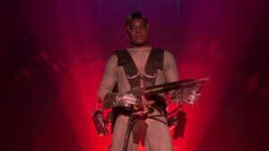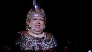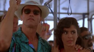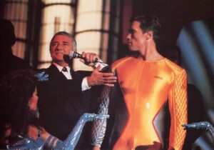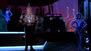 Este último elemento podría parecer muy actual, y de hecho lo es, haciendo la cinta bastante conectada con nuestra época actual, donde la televisión basura impera a las anchas por todas las cadenas. Inclusive hay un momento premonitorio, con las fake news y las imágenes recreadas por ordenador, donde se falsea la realidad. La película no es una comedia, desde luego, pero lo parece, por el tono chusco y caricaturesco con el que es narrado todo. Ese mundo distópico es retratado con un cierto toque crítico, sobre el camino al que está conduciéndose la sociedad, y, como dijimos, eso la hace muy actual, pero en realidad es solo un telón de fondo de cara a la galería. Y el intento auténtico, diríase, es efectuar un esperpento chirriante, cuyo mejor ejemplo es ese perseguidor hortera, Dynamo, que mientras intenta matar se pone a cantar ópera.