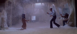 La batalla se desatará, pues, en la planta décima de un moderno hospital, con Karen alojada en una habitación donde la espalda cada vez se le deforma más, hasta que esta se desgarra y da a luz a un hechicero, en unos efectos bastante bien conseguidos. Menos convicción ofrece ese lagarto gigante sobreimpresionado, y que se percibe es un actor disfrazado, el decorado del pasillo helado ―aunque la idea es muy atractiva―, con una resolución que canta a cartón piedra, o los primitivos efectos visuales de la batalla final. Empero, eso confiere al film una textura de serie B agradecida.
