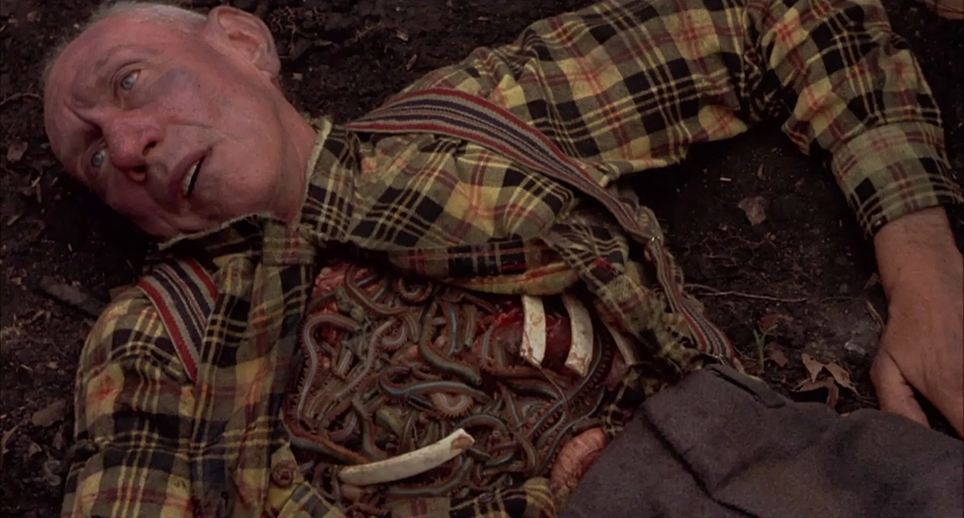 En la presente, obvio es, no tenemos pájaros, sino lombrices, distintas a las que aquí conocemos; se trata de unos ejemplares bien gorditos, con patas visibles, así como una cabecita con cuernos y una boca que se abre al modo de las sanguijuelas, de la variedad denominada «glycera». Cerca de un cuarto millón de ejemplares se emplearon en la cinta, sustituidas por réplicas falsas en los planos en los que se clavan en el rostro, en una magnífica labor de maquillaje obra del mítico Rick Baker.