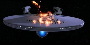 Las explosiones están rodadas al revés, para aprovechar en ese sentido la gravedad. Como en el espacio no hay gravedad, cuando se filma al revés todo se desploma hacia dentro; cuando la cámara está al revés con respecto al platillo el efecto es espléndido. Ken Ralston creó un método por medio del cual se enceraba una sección de la nave, después quemaba con una antorcha fotograma por fotograma pequeñas secciones del exterior de la Enterprise, y así mejoraba la imagen de los desperfectos. También juntaron secciones con acero y les prendieron fuego, lo que provocó muchas chispas, produciendo un efecto de cortocircuitos por todo el interior de la nave que resultaba espectacular.