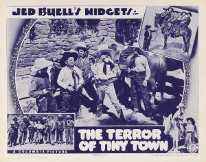 The Terror of Tiny Town es una absoluta rareza en la historia del cine: si no me equivoco, es el único wéstern protagonizado exclusivamente por enanos. Jed Buell, el productor, se inspiró para hacer la película cuando escuchó a un empleado de su productora, Spectrum Pictures, lamentarse del estado del negocio cinematográfico. Dijo que «si esta economía no se recupera, tendremos que empezar a hacer películas con enanos». Producción de serie B característica de la época, en muchas fuentes figura como una comedia, cuando no es así. En efecto, incluye algunas secuencias socarronas, pero no más que muchos otros wésterns de serie de la época, como esa ingente cantidad que ofrecía al gran actor George ‘Gaby’ Hayes como contrapunto humorístico, pero que en ningún momento son considerados como comedias.