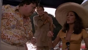 El director de Space Men (1960) maneja con destreza todo ese material, ayudado por esa experiencia que ha acumulado a lo largo de los años. Después del atraco inicial el film sufre un bajón, cuando comienza a presentarse la extensa galería de personajes, y ya sabemos que el cine de género italiano nunca fue demasiado afinado en ese aspecto. Destaca en particular un repelente fotógrafo gordo que no para de hablar y gesticular, que es acompañado de un joven ayudante que Margheriti parece empeñado en eludir de las tomas o mostrarle lo menos posible. Tiene un poco de mayor empaque el protagonista, interpretado por un simpático Lee Majors, caracterizado por una integridad entendida en el sentido que corresponde a su propio beneficio, o el del líder del grupo, un excelente, como siempre, James Franciscus, que semeja un malo de una pieza pero al que otorga matices interesantes. El reparto se amplía con tres roles femeninos; el más sustancioso es el de la atractiva Karen Black, y después tenemos dentro del equipo expedicionario de reportaje de modas a Marisa Berenson, que aparece bellísima pero inexpresiva, y Margaux Hemingway, que solo se muestra inexpresiva. Añadamos a un típico actor televisivo norteamericano, Gary Collins, que sonará a muchos sin conocerlo de nombre[3], y que tiene un papel casi de comparsa.